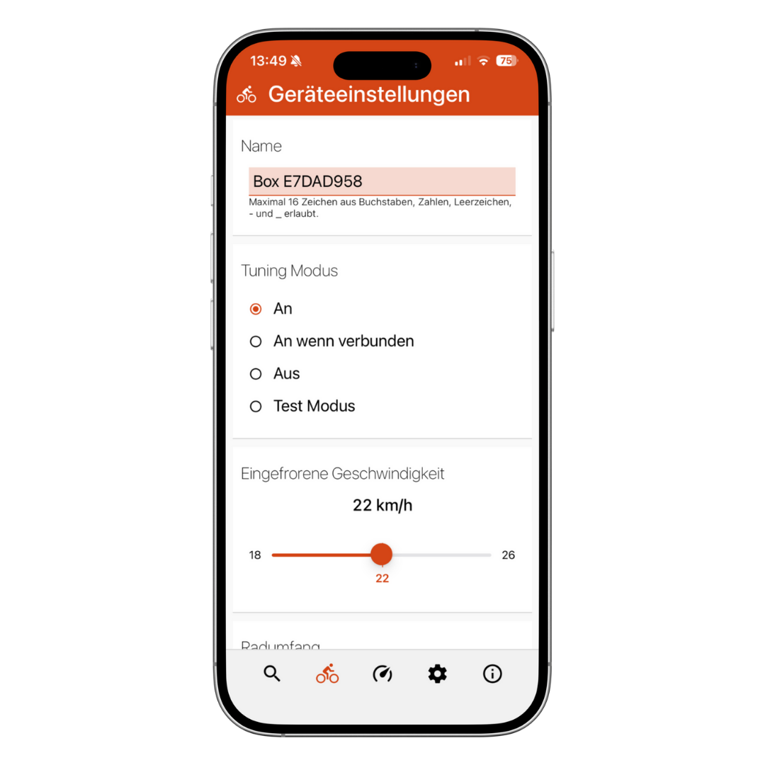 Boost Buddy bietet dir eine Vielzahl an tollen Funktionen um deine Box perfekt auf deine Tuningvorlieben einzustellen. Schalte das Tuning über dein Handy dynamisch während der Fahrt Ein und Aus oder aktiviere den Stealth-Mode. Darüber hinaus kannst du deine tatsächliche Geschwindigkeit und die gefahrene Distanz ablesen - Werte die auf deinem integrierten eBike Display durch das Tuning verfälscht werden. Um auch in Zukunft immer auf dem neuesten Tuning-Stand zu bleiben, besteht die Möglichkeit deine Box per Bluetooth mit einer neuen Firmware auszustatten.