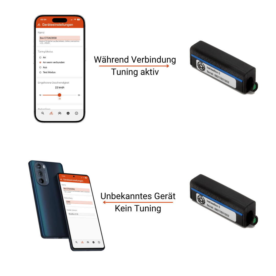 Für alle die diskret unterwegs sein wollen bieten wir unseren neuen Stealth-Tuning Modus. Mit dem aktivierten Modus An wenn verbunden erkennt die Box dein Handy als vertrauenswürdiges Gerät und aktiviert das Tuning nur, wenn auch tatsächlich dein Handy verbunden ist. Sollte ein anderes Handy oder gar keines verbunden sein, bleibt auch das Tuning inaktiv.